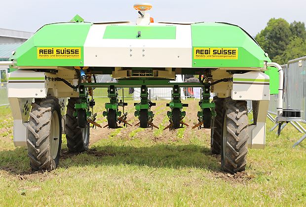 Der grosse Hackroboter Typ Dino zeigte auf dem Versuchsfeld eindrücklich, wie Handarbeit in Zukunft minimiert werden kann. Durch ein eigenständiges und präzises GPS-Führungssystem bewegt sich der Dino mit einer Genauigkeit von 2 cm selbstständig durch den Anbau und bekämpft Unkraut mechanisch.