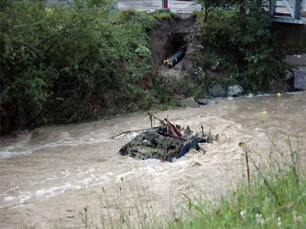 Im Gebiet Strahlholz in der Gemeinde Bühler wurde ein abgestelltes Auto von den Wassermassen in den Rotbach gerissen. Da Wrack konnte mehrere hundert Meter bachabwärts mit einem Kran geborgen werden.