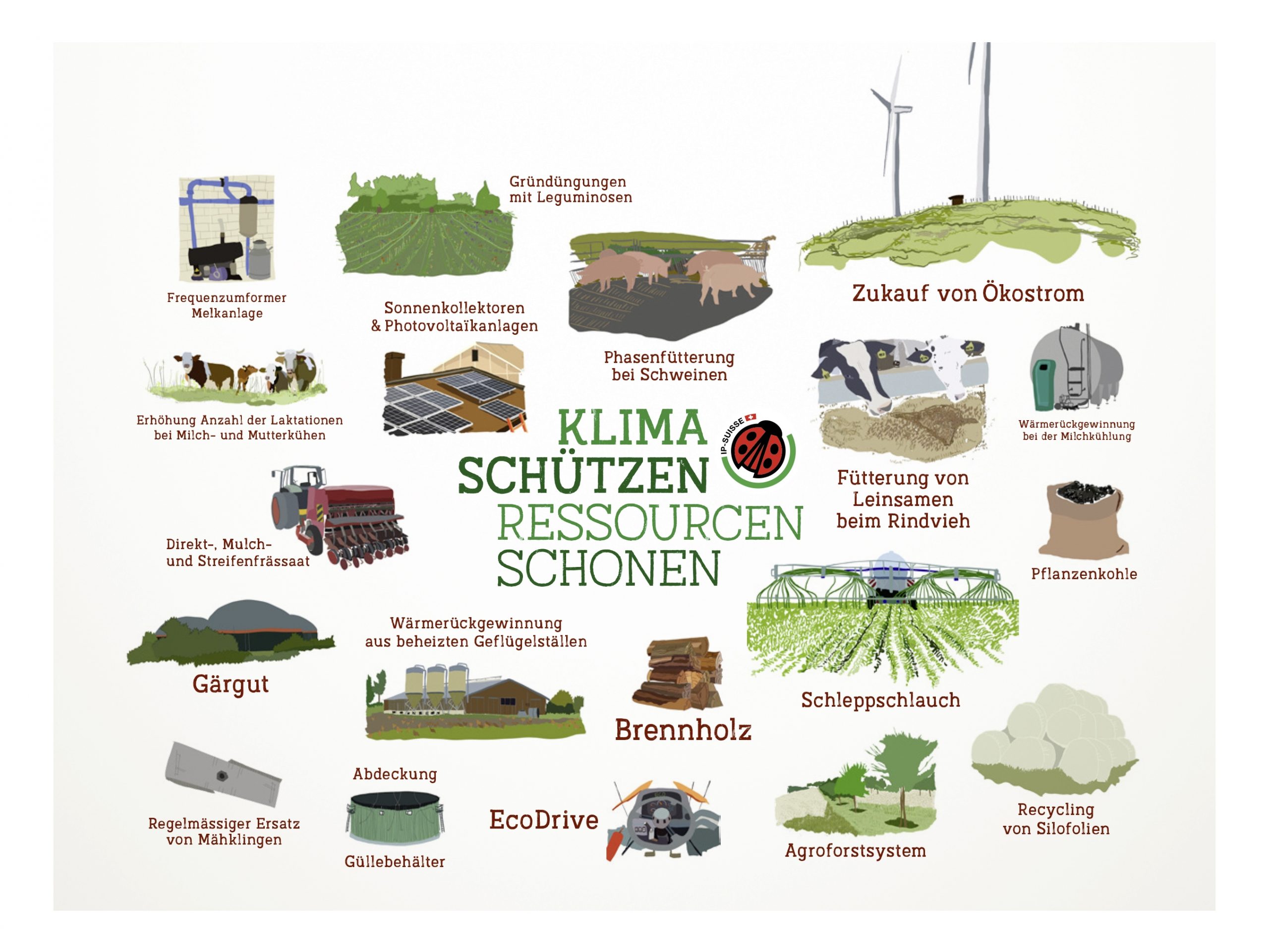 Der Massnahmenkatalog ist als eine Art Werkzeugkasten konzipiert. Die Labelbetriebe können aus dem Katalog die Massnahmen aus den Bereichen Energie, Tierhaltung, Düngermanagement, Pflanzenbau und Recycling aussuchen, die zu ihren Bedürfnissen und Rahmenbedingungen am besten passen.