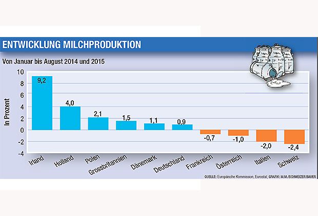 Auf der anderen Seite reduzierte sich insbesondere die Milchproduktion in Italien und Frankreich. 262'000 Tonnen betrug die Abnahme in beiden Ländern zusammen. Auch in der Schweiz wurde in den ersten 8 Monaten 2015 rund 56'000 Tonnen oder 2,4 Prozent weniger Milch produziert.