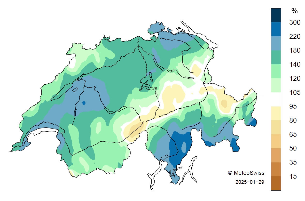 Räumliche Verteilung der Niederschlagssummen im Januar 2025, dargestellt in % der Norm 1991−2020 für den Zeitraum 1. bis 29. Januar.