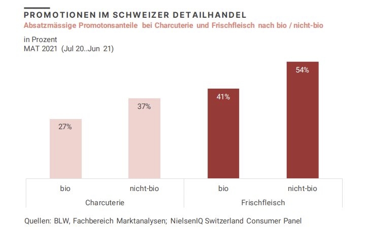 Bei Bio-Produkten sowohl bei Charcuterie als auch bei Frischfleisch deutlich weniger intensiv in Promotionen gekauft als Nicht-Bio-Produkte. Diese Beobachtung deckt sich mit der Gesamtsituation im Schweizer Lebensmittel-Detailhandel: Der Umsatzanteil von Bio-Lebensmitteln in Aktion betrug knapp 23% gegenüber 31% von Nicht-Bio-Lebensmitteln. «Dies deutet ebenfalls auf unterschiedliche Vermarktungsstrategien für Bio-Produkte im Vergleich zu den restlichen Warengruppen hin», heisst es im Bericht. Gemäss Branchenexperten erklärt sich die tiefere Aktionsintensität aber auch mit dem reduzierten Warenangebot, das während einer Promotion erhöht sein müsste.