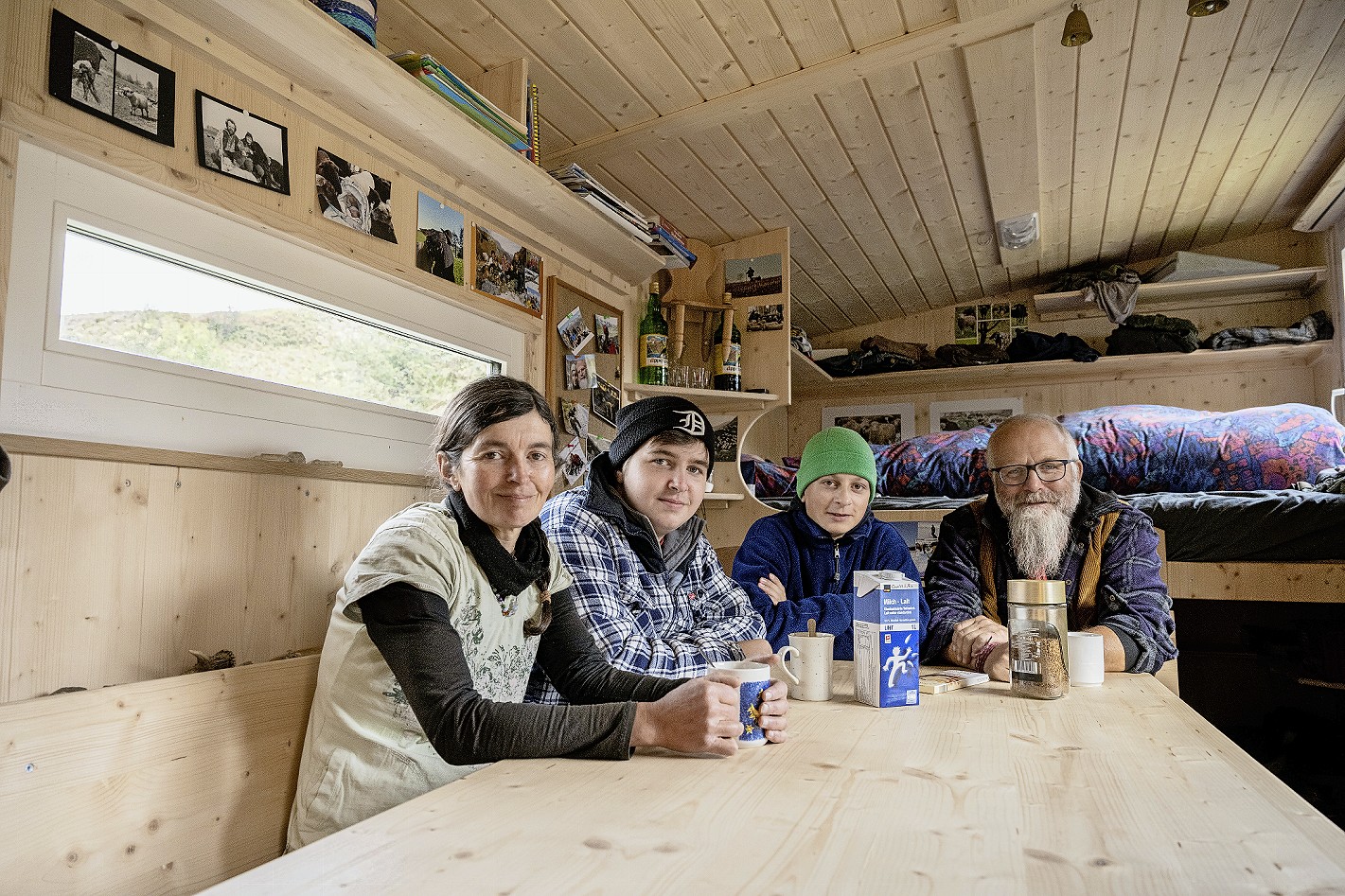 Gemütlich ist es hier drinnen. Draussen ist es feucht, Nebelschwaden ziehen die Alpwiesen hoch, ab und zu hört man den Wind um den Bauwagen pfeifen. Drinnen sorgt das Feuer im Holzofen für behagliche Wärme, an den vielen Haken neben dem Fenster trocknen die Regenjacken und in den Tassen dampft der Kaffee.