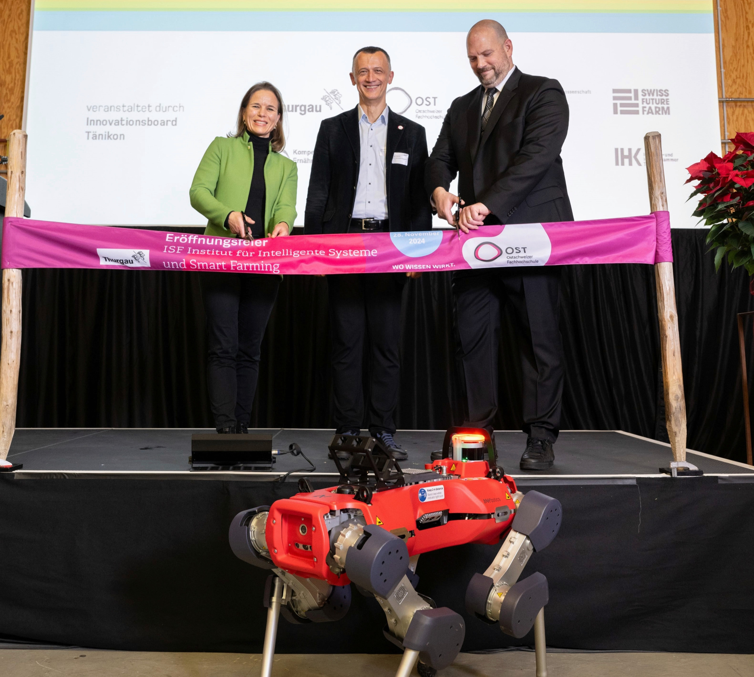 Eröffnung des neuen Instituts für Intelligente Systeme und Smart Farming ISF mit Thurgauer Regierungsrätin Denise Neuweiler, Institutsleiter Dejan Šeatović und dem Rektor der Ostschweizer Fachhochschule Daniel Seelhofer. Der Bring- und Hohlroboter «ANYmal» im Vordergrund brachte die Scheren auf die Bühne zum Durchschneiden des Bandes.