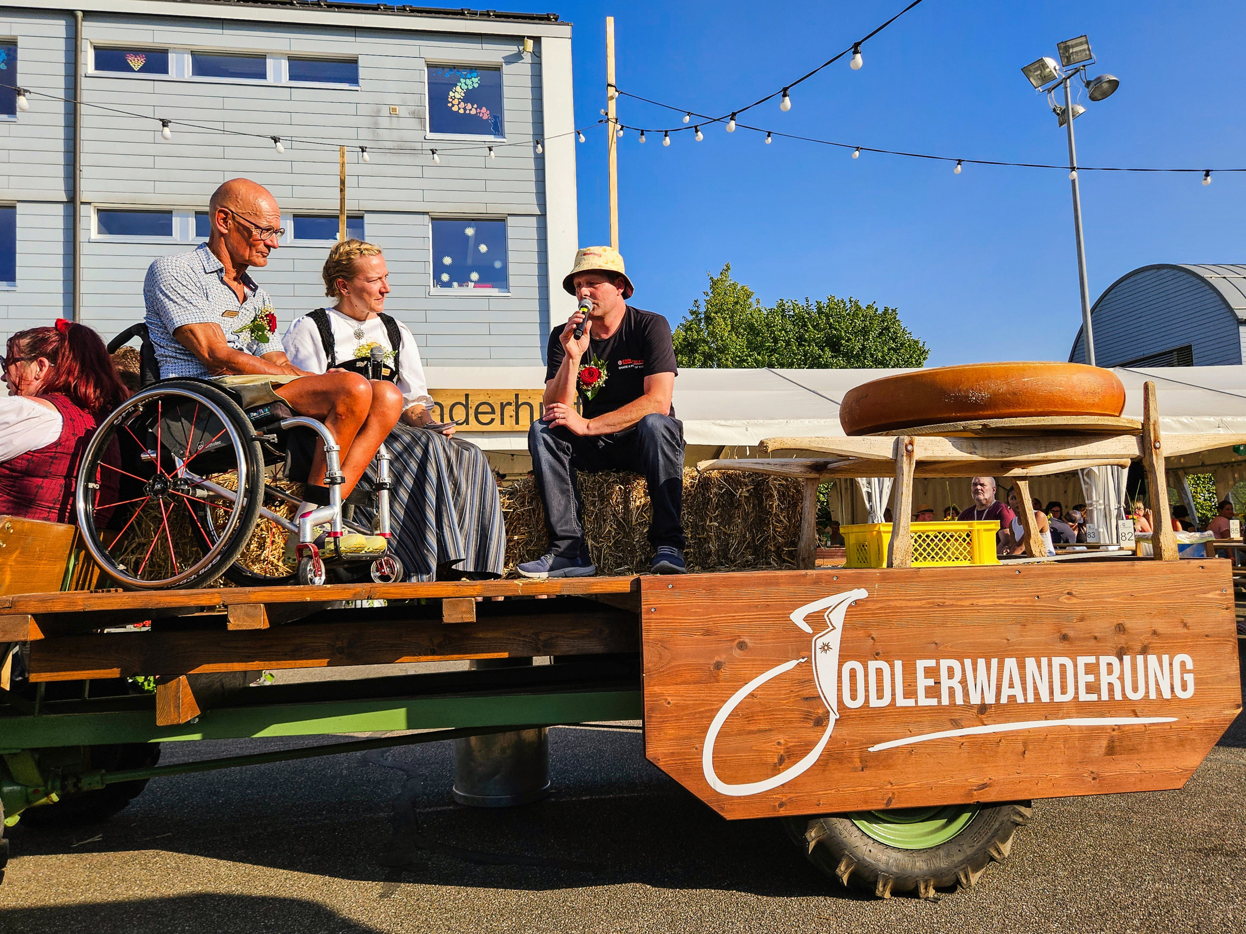 Der Höhepunkt der Wanderung war die Chästeilet rund um den Käsegötti, den mehrfachen paralympischen Sieger Heinz Frei. Der Emmentaler Käse-Laib, von der Käserei Koppigen gesponsert, erfolgreich versteigert werden. Wie die Organisatoren schreiben, geht der Erlös aus dem Verkauf des Käses, der seit seiner Taufe im Mai 2025 den Namen «Para-Rugeli» trug, auf Wunsch des Käsegötti an das Para Racing Team.
