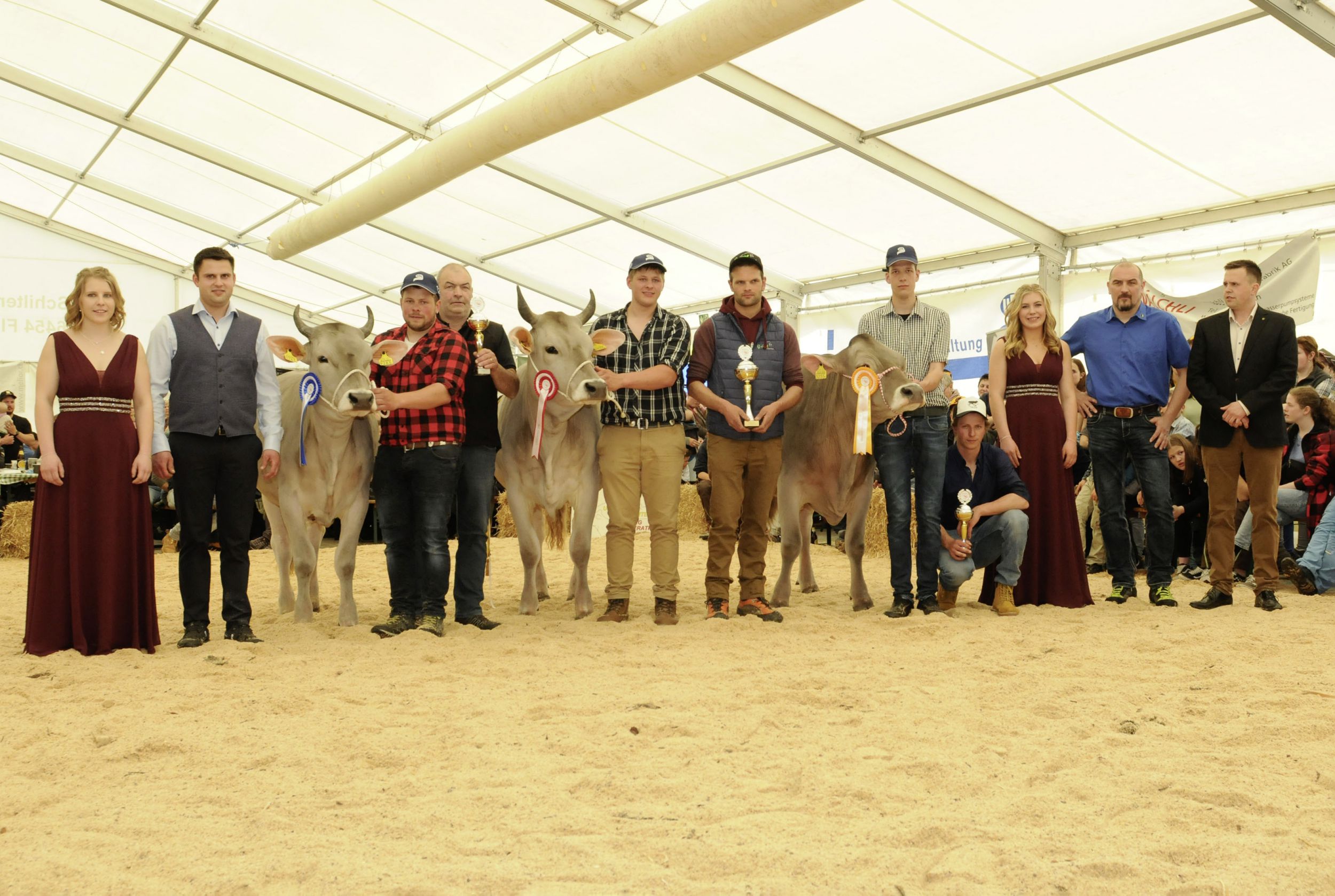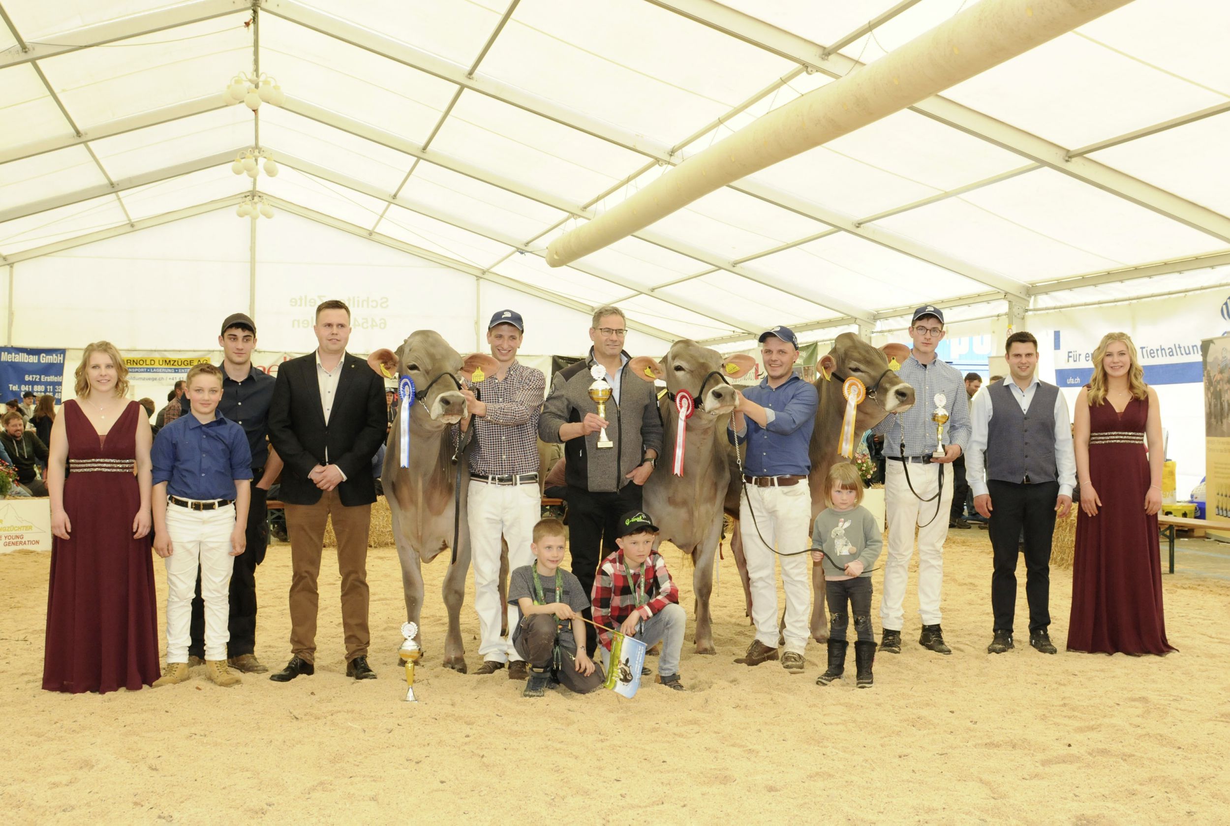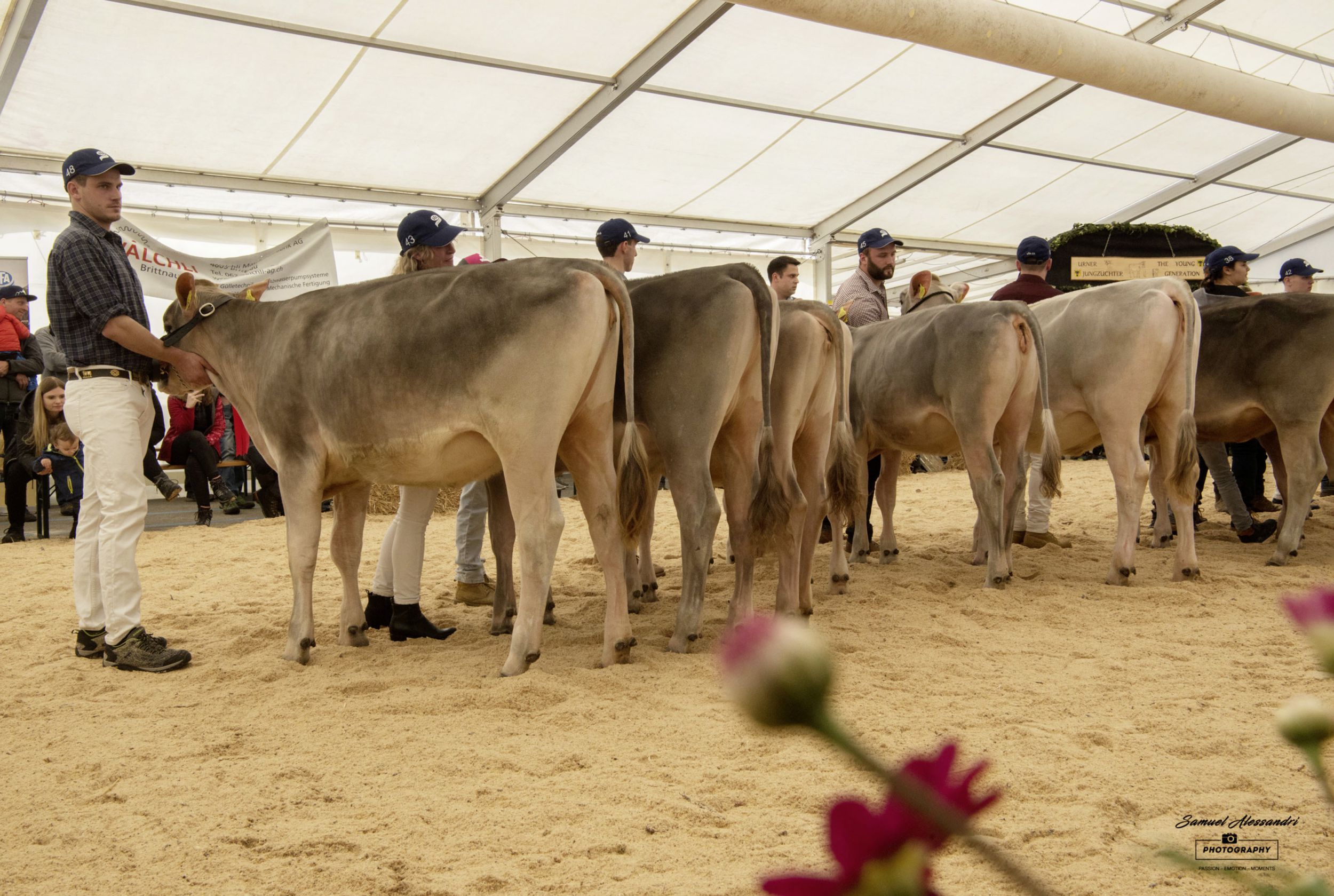 Gesamtchampion BS: wallimannBV Tu Sg Troya (Mitte), G-Wal Mountain Cows, Bürglen UR; Vize-Champion Gesamtchampion BS: Zrotz Brice Vera (links), Three-Salzgeber, Tom Salzgeber, Pany GR; Mention Honorable Gesamtchampion BS: Papa Schlumpf Pascal, Thomas Roffler-Flütsch, Andri Bosshard, Grüsch GR. Marcel Wipfli