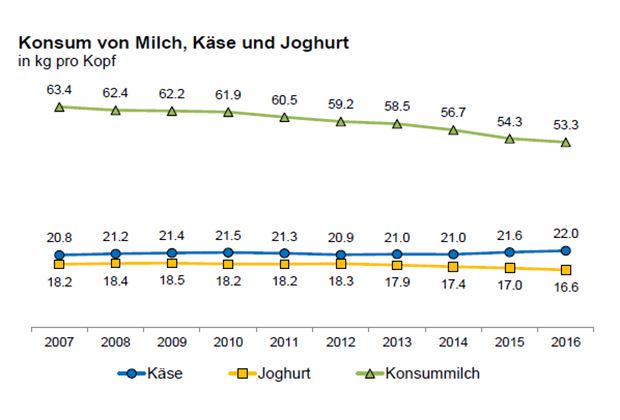 Im Jahr 2007 belief sich der Pro-Kopf-Milchkonsum auf 63,4 Kg. Seither ist der Konsum um 16% zurückgegangen, und steht nun bei 53,3 Kg Milch pro Kopf. In der selben Zeit haben Milchgetränke an Beliebtheit gewonnen und um 12,6% zugelegt.