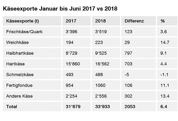 Insgesamt wurden 33'933 Tonnen Käse ausgeführt. Besonders die Exporte ausserhalb Europa wiesen mit einem Plus von 14.2 Prozent (+818 Tonnen) ein ausserordentliches Wachstum auf. In Europa konnten die Ausfuhren um 1'235 Tonnen oder 4.7 Prozent gesteigert werden.