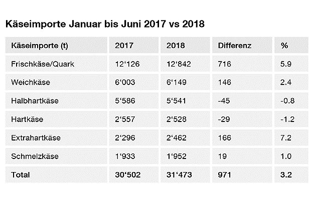 Auch die Käseimporte haben zugenommen. Diese stiegen um 3.2 Prozent oder 971 Tonnen auf 31'473 Tonnen. Aufgrund der Abschwächung des Schweizer Frankens haben sich die Importpreise erhöht. Belief sich der Durchschnittspreis pro Kilo Importkäse im 1. Semester 2017 auf 6.22 Fr., liegt er im gleichen Zeitraum 2018 bei 6.88 Fr.pro Kilo.