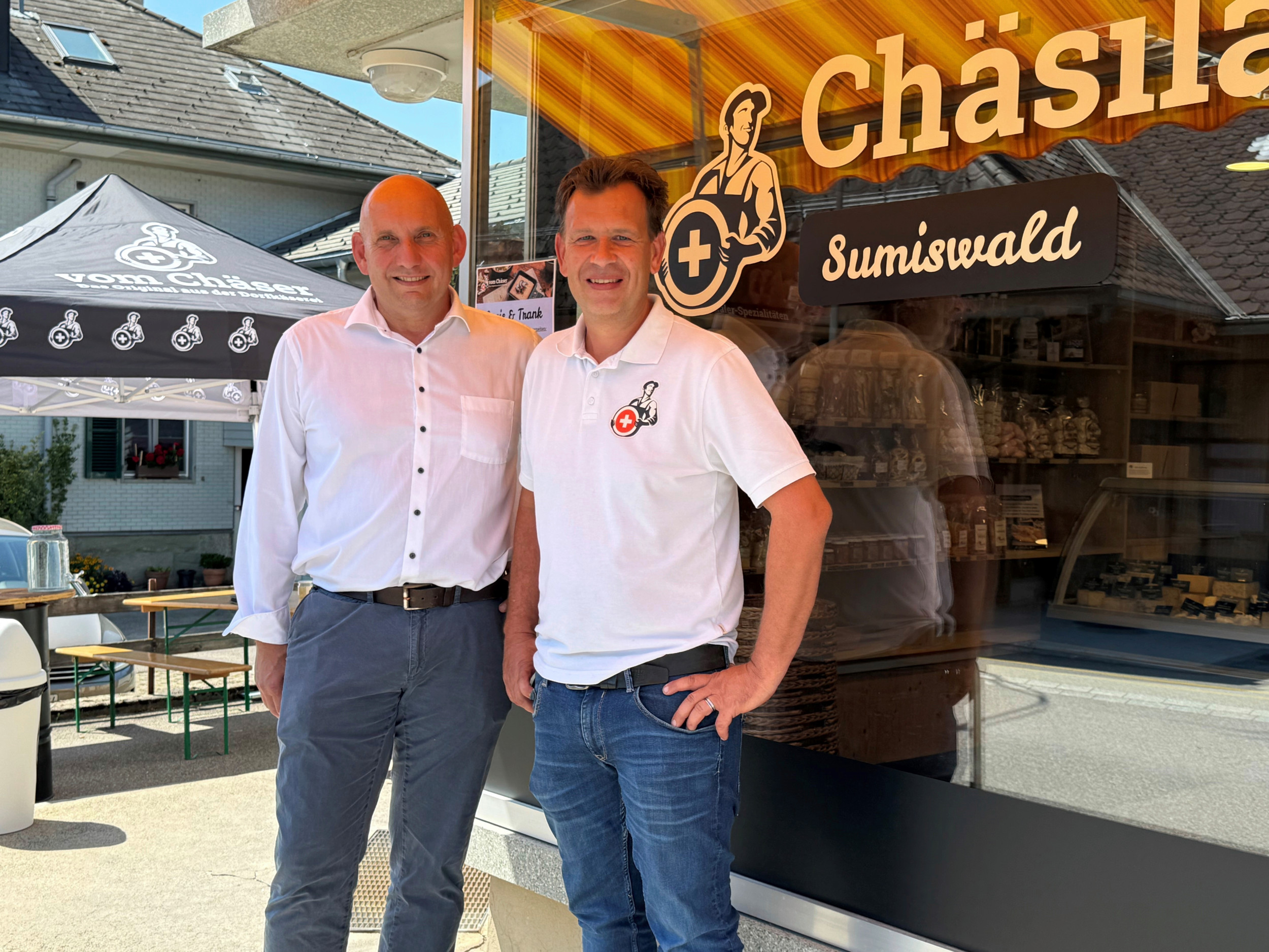 Matthias Moser, VR-Präsident der Dorfkäserei Sumiswald AG (links) und Thomas Vogt, Geschäftsführer «vom Chäser». Vogt übernahm den Verkaufsladen der Käserei.