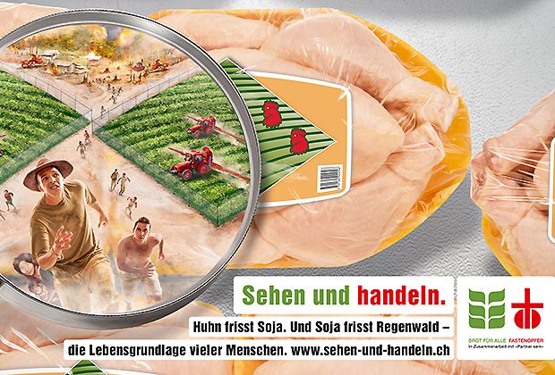 Allein der Anbau des Futtermittels für die Tierhaltung in der Schweiz benötige im Ausland gleich viel Fläche wie in der Schweiz an Ackerbaufläche zur Verfügung stehe. Unsere Tiere würden somit den Kleinbauernfamilien in Entwicklungsländern buchstäblich die Lebensgrundlagen wegfressen, kritisierten die Hilfswerke.