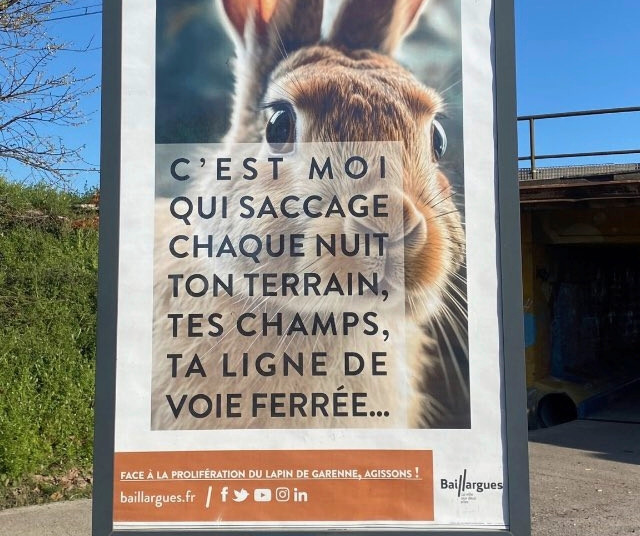 La recette du civet de lapin pour lutter contre une « prolifération des lapins de garenne » : c’est LA nouvelle campagne d’affichage de la mairie de Baillargues, dans l’Hérault. Derrière cette idée, Jean-Luc Meissonnier veut dénoncer des dégâts considérables causés par l’espèce. pic.twitter.com/maBDhnGNEy