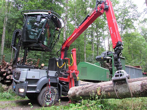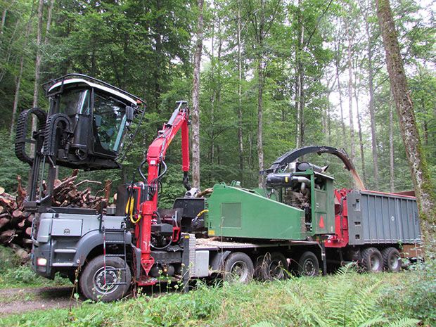 Das von Unternehmer und Maschinenoperateur Karl Burkard aus Hausen am Albis ZH entworfene Gefährt auf einem Lkw-Allradchassis MAN TGS 33.540 6x6 BB umfasst einen Wüst-Hacker BBHK-120 und wird von einem 500 PS-John Deere-Motor angetrieben. Damit lassen sich Baumstämme bis 60 cm Dicke zu Energieholz verkleinern.