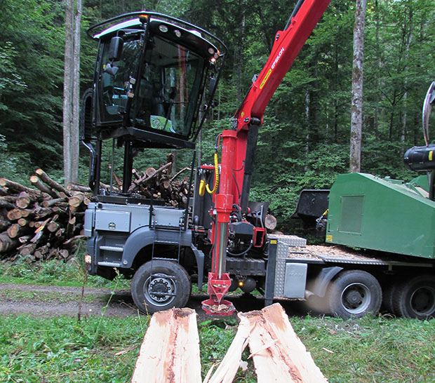 Der integrierte Palfinger-Kran mit 10 Metern Reichweite befördert das Hackgut in den aufliegenden Zuführtrichter mit Zubringerband. Vorne seitlich befindet sich ein ebenfalls von Karl Burkard entwickelter hydraulischer Holzspalter, der – die Vorführung im Gelände beweist es eindrücklich – Stämme bis 110 cm Dicke locker spaltet.