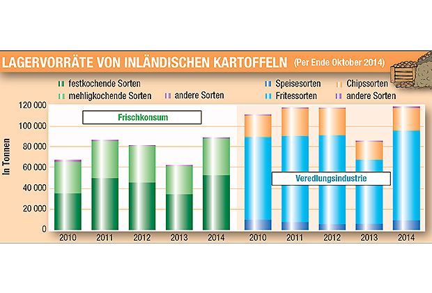 Per 31. Oktober 2014 lagen insgesamt 208'844 Tonnen Kartoffeln an den Lagern. Zählt man die von den Produzenten noch zur Ablieferung gemeldeten Mengen dazu, sind es 210'201 Tonnen und damit rund 7 Prozent mehr als im Durchschnitt der letzten fünf Jahre. Dies zeigen Zahlen von Swisspatat.