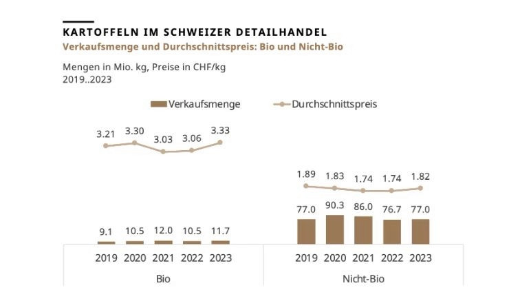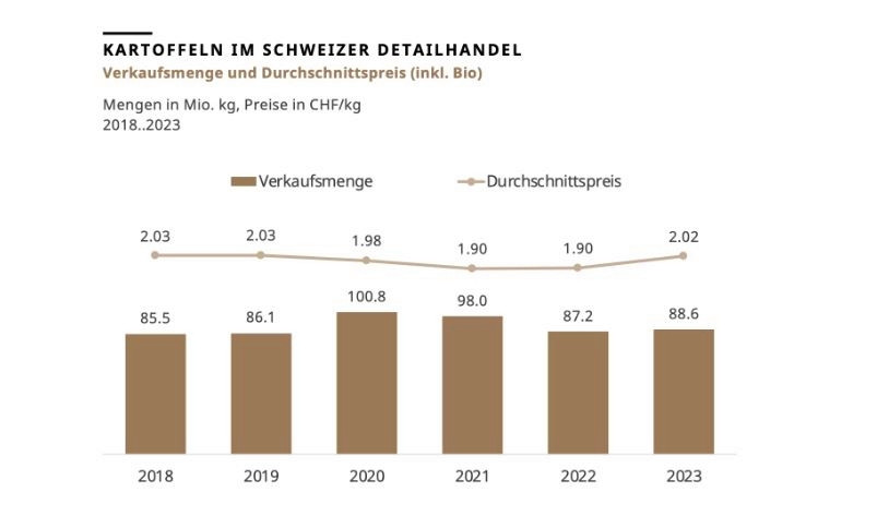 Im Jahr 2023 wurden 88,6 Mio. Kilogramm Speisekartoffeln im Schweizer Detailhandel verkauft. Damit gab es erstmals seit 2020 wieder eine Zunahme im Vergleich zum Vorjahr (+1.7 %).