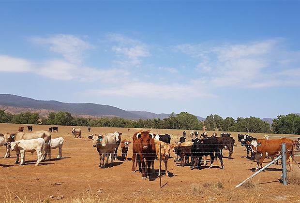 Luftlinie etwa 300 Kilometer vor der Ostküste trafen wir wieder Beef an, extrem dünne Tiere auf erdigen Flächen, Futter war keines zu sehen. Wir sahen zufällig den Farmer, ein älterer Herr, der erschöpft wirkte. 1975 habe er 3000 acres (2,4 acres = 1 Hektar). von seinem Vater übernommen, heute besitze er 28‘000 acres (11'600 ha). Er hatte rund 4000 Tiere, die Herde habe er nun halbiert, wegen des Futtermangels.