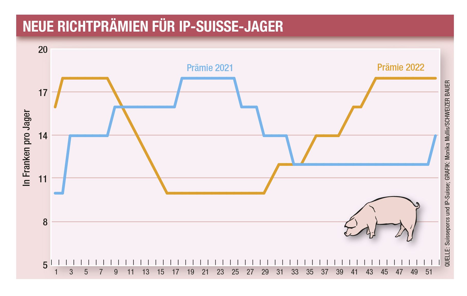 Auch für IP-Suisse-Jager gibt es einen Zuschlag. Bis jetzt war dieser von der Labelprämie der Mastschweine abhängig. Stieg die Prämie bei den Mastschweinen um 5 Rp./kg SG, gab es für die Jager 2 Franken mehr, sank die Mastschweineprämie um 5 Rp./kg SG, gabs 2 Franken weniger. Diese Kopplung sendete laut IP-Suisse jedoch ein falsches Signal, da es eher zu viele Jager gab, wenn die Jagerprämie hoch war, bei einem tieferen Zuschlag tendenziell zu wenige.
