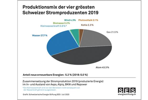 In der Kurzstudie «Strommix 2019» hat die Schweizerische Energie-Stiftung SES die Stromproduktion der vier grössten Schweizer Energieversorger Axpo, Alpiq, BKW und Repower untersucht. Dabei zeigt sich, dass die fossile und nukleare Stromerzeugung nach wie vor zwei Drittel der Stromproduktion ausmacht. Ein Drittel wird durch erneuerbare Energien gedeckt, vornehmlich Wasserkraft. Im Vergleich mit dem Schweizerischen Strommix mit 56.4 Prozent Wasserkraft und 35.2 Prozent Atomkraft (BFE 2020) fällt die Bilanz der Stromversorger somit deutlich klima- und umweltschädlicher aus.