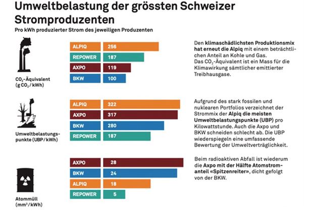 Die Analyse der Schweizerischen Energiestiftung (SES) über Umweltbelastungen aus der Stromproduktion der vier grössten Schweizer Stromversorger zeigt: Axpo, Alpiq, BKW und Repower erzeugen zwei Drittel ihres Stroms aus fossilen und nuklearen Energiequellen. Damit gehen eine hohe CO2- und Umweltbelastung einher.