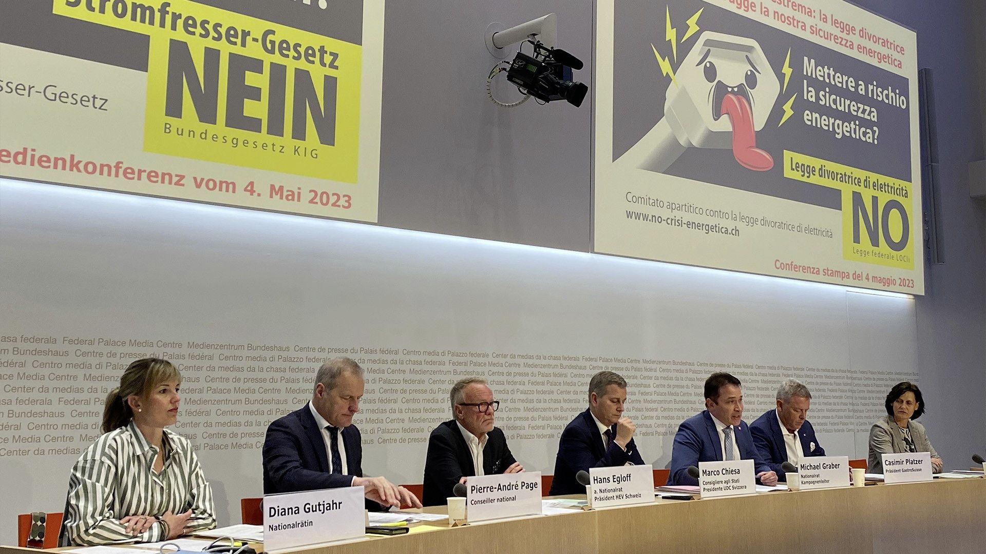 Heizöl, Benzin, Diesel und Gas, die rund 60 Prozent des Schweizer Energieverbrauchs ausmachten, würden de facto verboten, Heizen und Autofahren wären nur noch elektrisch möglich. Die Landschaft werde mit Solarpanels und Windrädern überbaut, und im Winter werde es an bezahlbarem Strom mangeln. Der Umbau der Energieversorgung sei realitätsfremd. Die SVP reichte ihr Referendum mit knapp 104›000 Unterschriften ein.