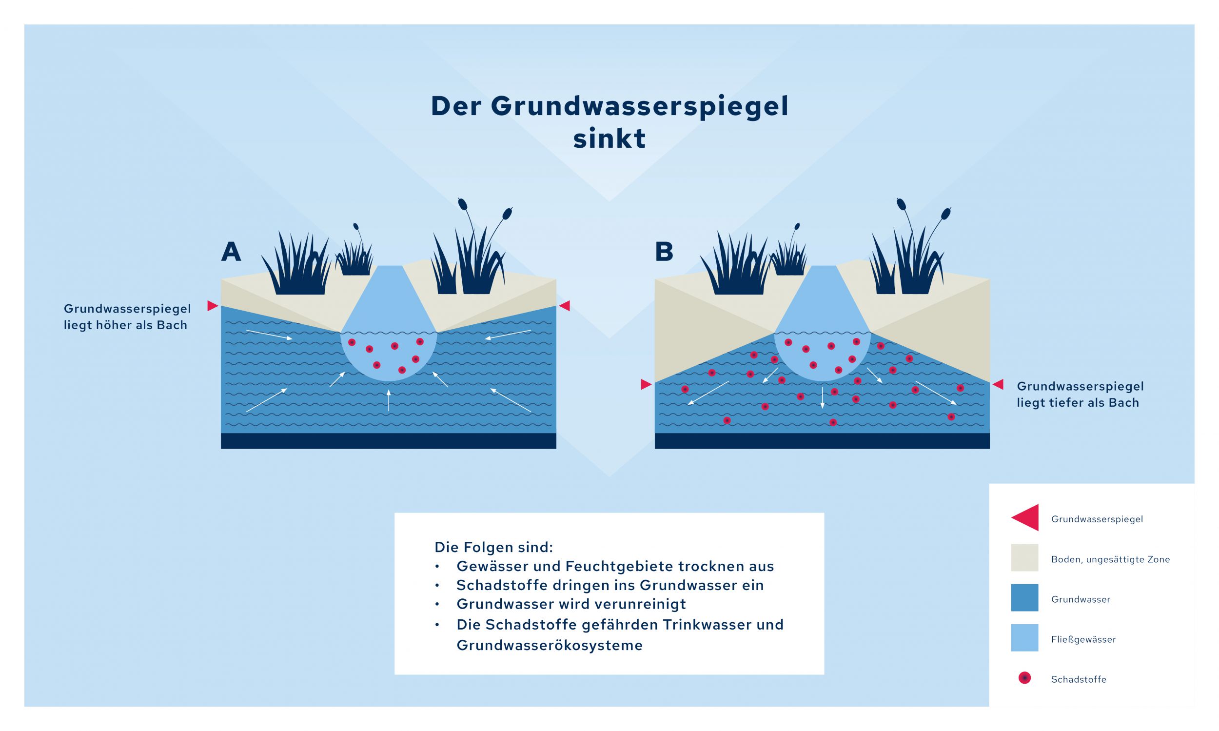 Anders als bisher drückt das Grundwasser durch den gesunkenen Grundwasserstand an vielen Stellen nicht mehr nach oben und speist Bäche und Flüsse (exfiltriert), sondern das Wasser der Fliessgewässer versickert nun in den Untergrund (infiltriert). «Als Folge dieser Druckumkehr können Schadstoffe ins unterirdische Nass eindringen», so die Forscher um Anke Uhl vom Arbeitskreis Quellen und Grundwasser der Deutschen Gesellschaft für Limnologie: «Denn in den Bächen und Flüssen fliessen nicht nur Regen- und Quellwasser, sondern auch die Abläufe von Kläranlagen.»