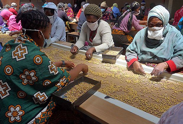 Vom Erfolg der stark wachsenden QFP profitiert aber nicht nur die landwirtschaftliche Bevölkerung, wie sich auf dem Betriebsrundgang zeigt. In den Verarbeitungs- und Lagerräumen des Unternehmens sortieren rund 200 Frauen von Hand und an langen Förderbändern Hülsenfrüchte zu einem bescheidenen aber lokal überdurchschnittlichen Lohn von Fr. 2.50 pro Tag.