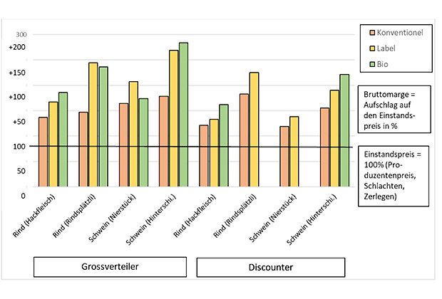 Ein Kilogramm Rindsplätzli kostet beim Grossverteiler wahlweise 21.30 Fr. oder auch 57.50 Fr., je nachdem, ob es sich um Labelfleisch, in diesem Fall um Biofleisch, oder beim günstigeren Angebot um konventionell produziertes Fleisch handelt. Dieser deutliche Preisunterschied veranlasste den Schweizer Tierschutz (STS), eine Studie zu verfassen, in welcher die Preise bei den beiden Grossverteilern (Coop und Migros) und bei den Discountern (Aldi, Lidl und Denner) anhand von vier Standardprodukten beim Rind (Hackfleisch und Rindsplätzli) und beim Schwein (Nierstück und Hinterschinken) untersucht wurden.