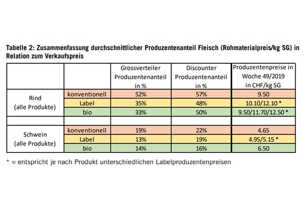Laut der «Marktanalyse Labelfleisch» des STS werden «nachhaltig und tierfreundlich erzeugte Fleischsortimente im Markt preislich unattraktiv positioniert, die Preise im konventionellen Sortiment dagegen künstlich niedrig gehalten und die Produkte zu Tiefstpreisen angeboten». Und insbesondere würden auch die Labelproduzenten nicht proportional am Verkaufspreis beteiligt, obwohl sie es seien, die den Mehrwert im Bereich Tierwohl erzeugten, kritisiert der Schweizer Tierschutz das Preissystem.