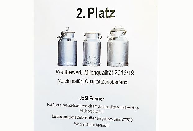 Durchschnittliche Zellzahlen von 57'500 während eines ganzen Jahres – das ist top. Joël und Marianne Fenner aus Ottikon ZH haben das geschafft. Und beim Wettbewerb Milchqualität 2018/19 des Vereins «natürli Qualität Zürioberland» den zweiten Rang belegt (siehe Auszeichnung). Noch viel erstaunlicher ist aber die Geschichte, die hinter der herausragenden Milchqualität steckt.
