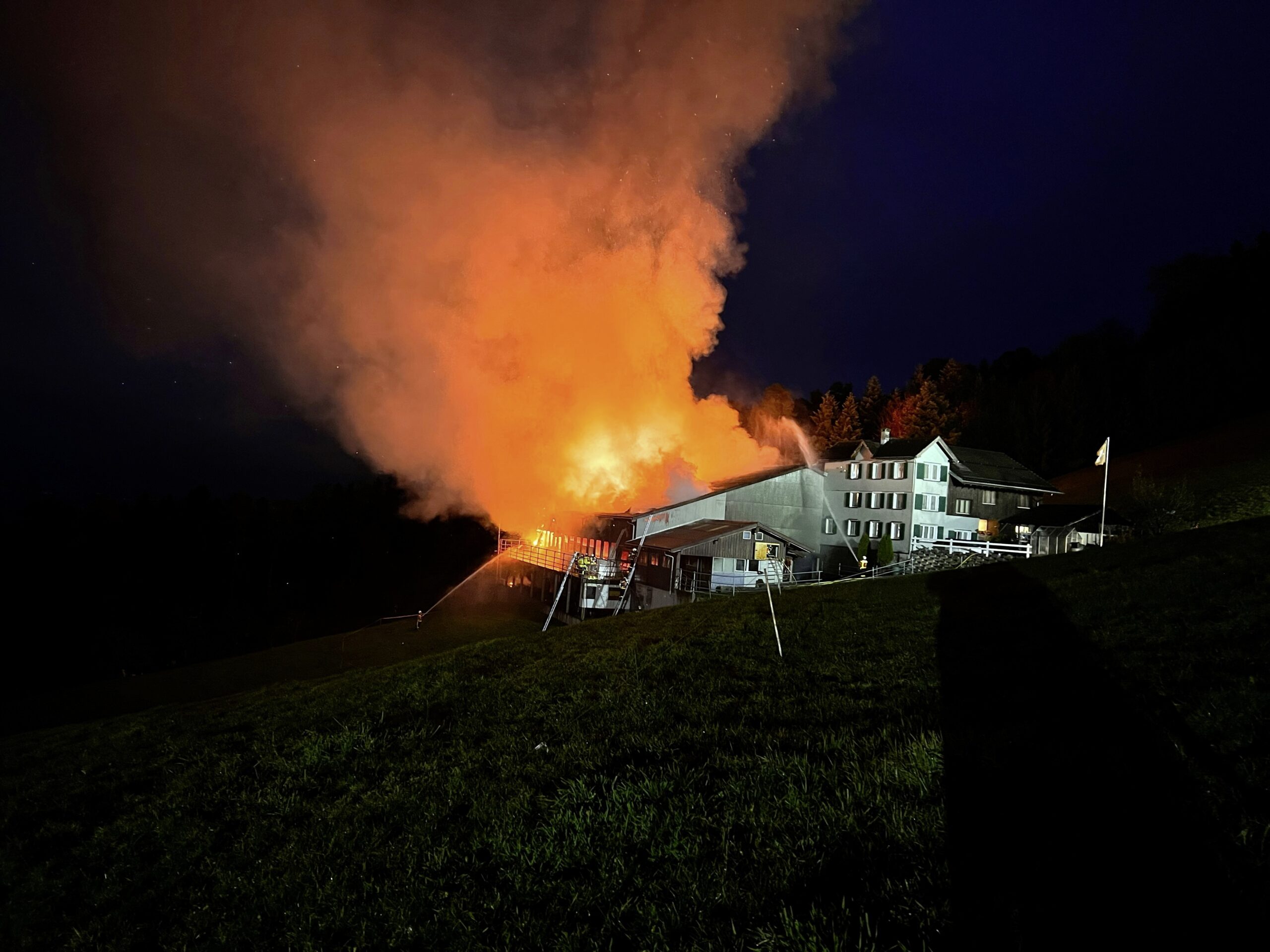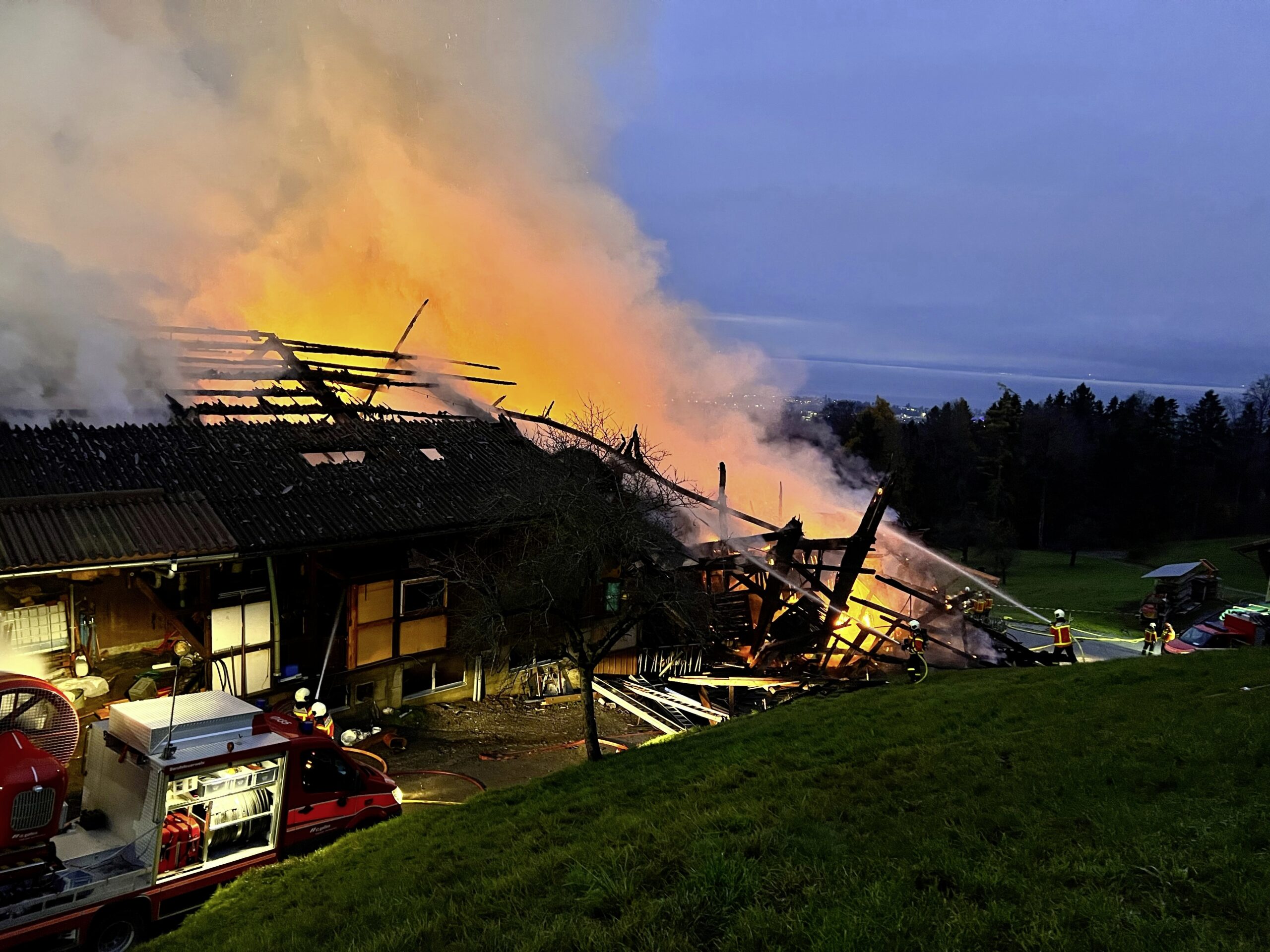 Als die Einsatzkräfte am Brandort eintrafen, war das Gebäude in Vollbrand. Der Dachstock war bereits ausgebrannt. Die Bewohner des angrenzenden Wohnhauses verliessen die Liegenschaft selbstständig.