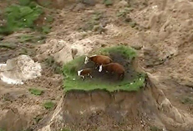 Drei Kühe gehörten auch zu den Gestrandeten: Bei dem Beben war die Weide um sie herum weggebrochen und meterweit abgesackt. Die Kühe standen plötzlich auf einer winzigen Grasinsel am Abgrund.