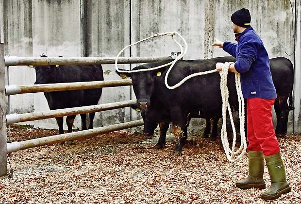 Auch müssen die Rinder an Menschen gewohnt sein. Sie liessen sich denn auch nicht gross aus der Ruhe bringen, als die Kursteilnehmer ihre Technik mit Wurfschlingen verfeinerten oder mehrmals ansetzen mussten, bis die Halfter perfekt sass und der Anbindeknoten hielt.