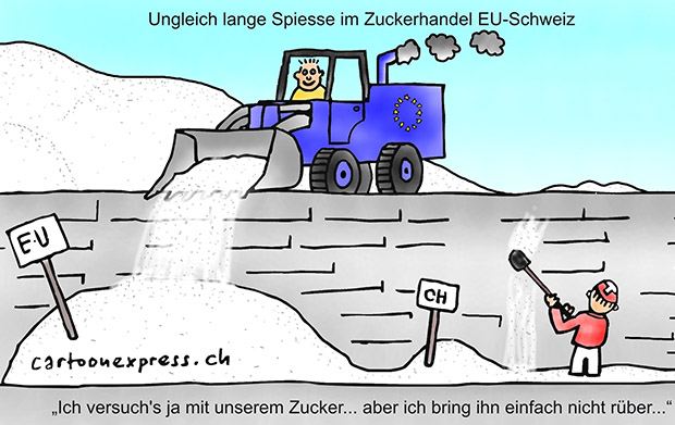 Die EU darf einen Zoll von 42 Euro pro 100 Kilo auf Zuckerimporte aus der Schweiz erheben. Die Schweiz hingegen darf Zuckerimporte nur so weit mit einem Zoll belegen, dass sie maximal das EU-Preisniveau erreichen. Zwar kann seit dem 1. Februar 2005 im Handel mit der EU Zucker in verarbeiteten Produkten zollfrei in die Schweiz importiert und in die EU exportiert werden (Doppel-Null-Lösung). Reiner Zucker fällt aber als Agrarbasisprodukt nicht in den Deckungsbereich der Doppel-Null-Lösung, sondern ist gemäss dem Agrarabkommen von 1999 geregelt. Deshalb haben die Beteiligten nach wie vor ungleich lange Spiesse.