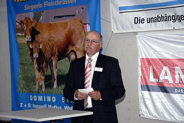 Ruedi Haudenschild erklärt die Vorzüge der Fleischrassen-Siegerkuh Domino Sina.