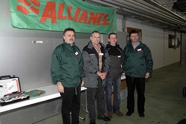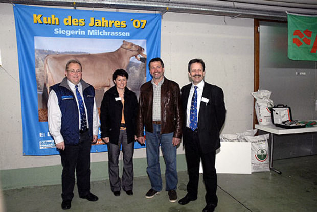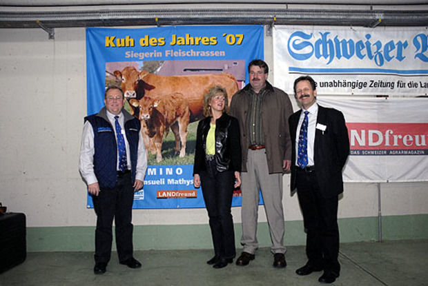 Schweizer Bauer Chefredaktor Ruedi Haudenschild (links) und Verlagsleiter Ueli Utiger (rechts) mit Barbara und Hansueli Mathys, die mit Domino Sina bei den Fleischrindern siegten.