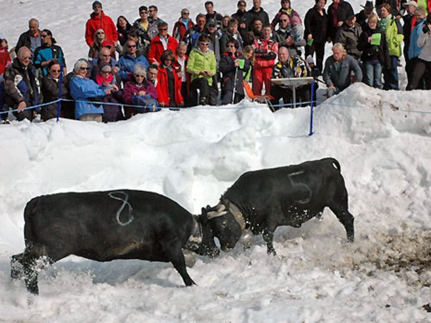 Im Oberwallis kämpfen am 12. März acht Eringer-Rinder in einem Kuhkampf auf Schnee. Selbst im Wallis ist der Schneekampf eine Eigenheit und stösst auch nicht bei allen Züchtern auf Begeisterung. Gefahr für die Tiere besteht aber nicht.