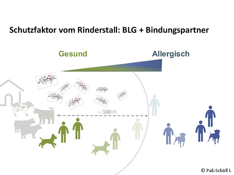 In «detektivischer Suche» habe man nun den Milcheiweissstoff Beta-Lactoglobulin als Allergie-abwehrenden Stoff ausgemacht, so die Forscher. Er war in grosser Menge im Staub von Rinderställen nachweisbar und wurde von dort sogar bis in die Betten der Menschen getragen. «Wir konnten BLG in abfallender Konzentration bis fast 300 Meter um den Stall herum messen», berichtet Pali-Schöll.