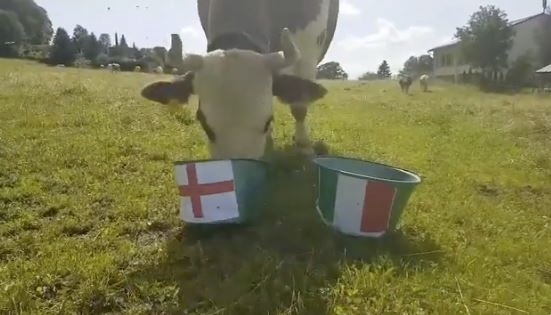 Zehntausende Engländer werden ihr Team zum Sieg schreien. Doch die Italiener sind leicht zu favorisieren. Das sieht Kuh Senta von Biolandwirt Christian Tüscher in der Nähe von Schüpfen BE aber anders. Senta war sich beim Tipp zum Finale zwar zu Beginn nicht ganz sicher. Denn zuerst schnupperte sie am Kübel von Italien. Doch schlussendlich entschied sie sich für England.