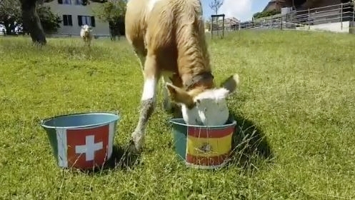 Das sieht auch das Kuhorakle so. Landwirt Christian Tüscher lässt seine Tiere über den Ausgang der Spiele tippen. Dabei stellt er zwei Futterkessel auf die Weide. Die Kälber oder Kühe wählen dann ihren Favoriten. Bei den beiden letzten Spiel lag das Kuhorakel richtig.