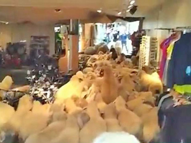 Weil das Leitschaf offenbar seinem Spiegelbild in einer Glastür gefolgt ist, hat sich in Österreich eine ganze Herde beim Alpabzug in ein Sportgeschäft verirrt. Zwei Hirten gelang es, die rund 80 Tiere zu beruhigen und wieder auf den richtigen Weg zu bringen. Mit Video