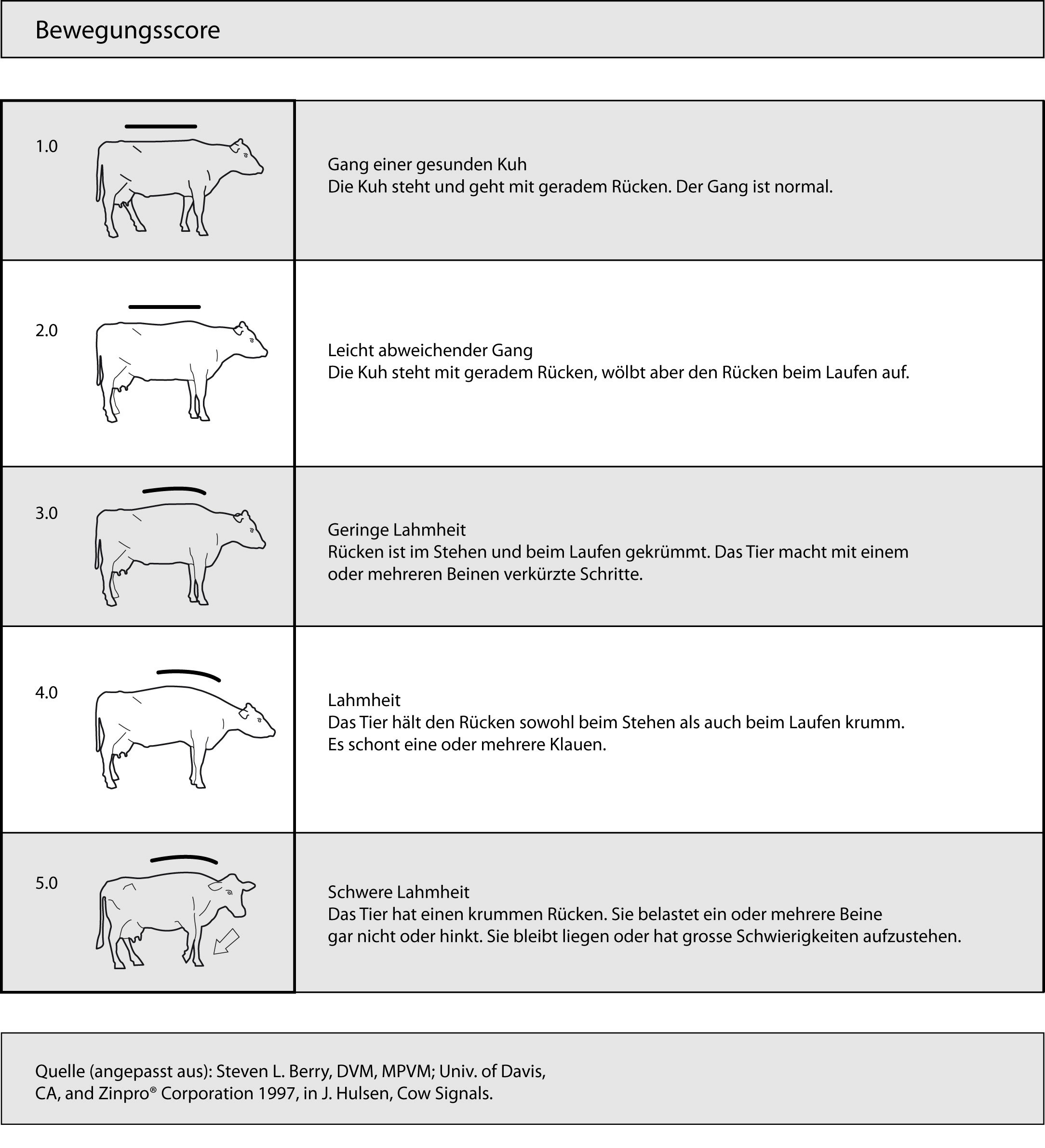 Die Lahmheitsbewertung mit dem sogenannten «Locomotion Score» (rechts) gibt gute Hinweise auf Lahmheiten. So hat eine Kuh mit einem krummen Rücken, die ein oder mehrere Beine gar nicht belastet oder die hinkt, liegen bleibt oder grosse Schwierigkeiten hat aufzustehen, den Score 5 und damit eine schwere Lahmheit.