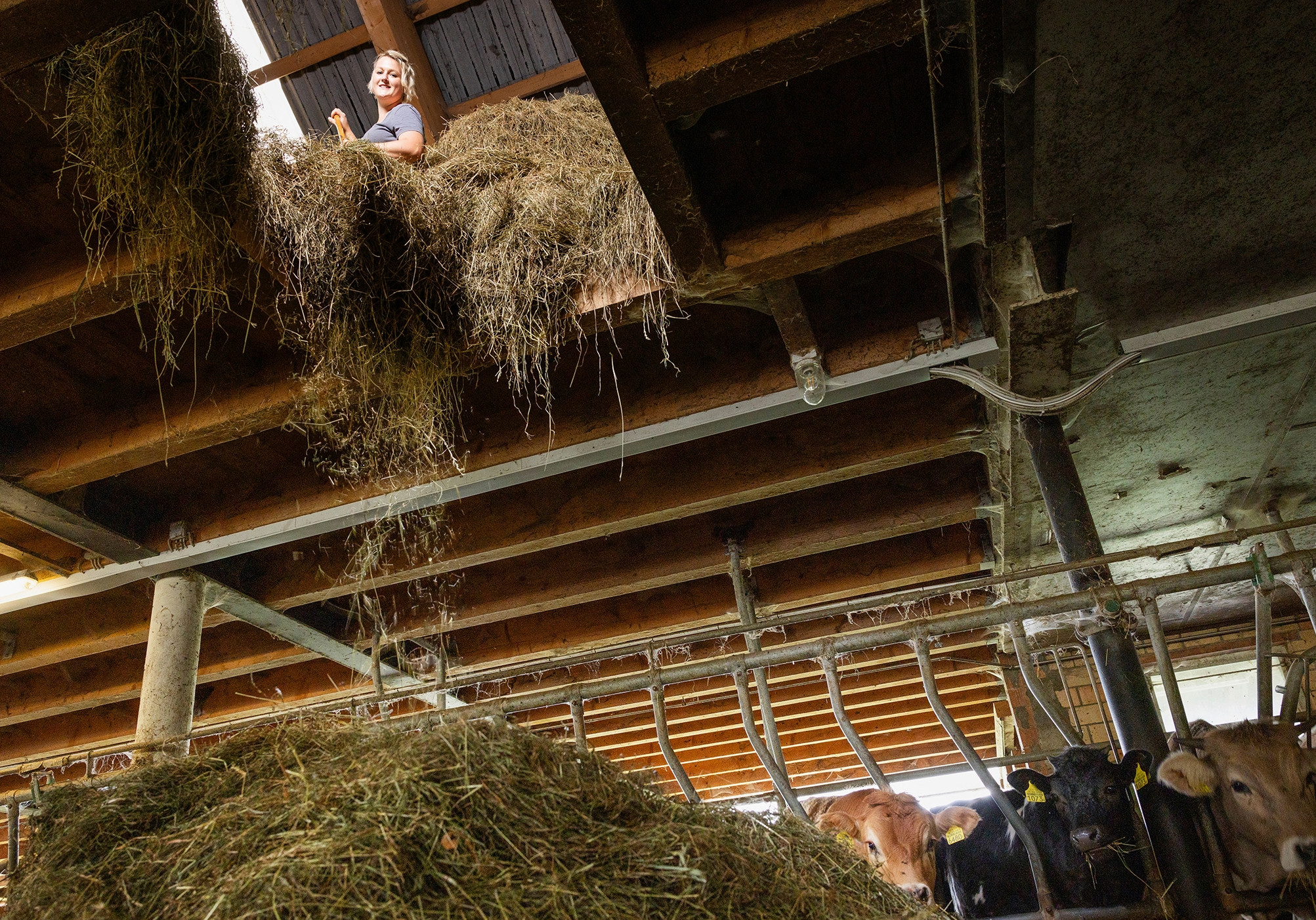 Der Hof der Familie Röösli liegt in den Hügeln oberhalb von Hasle im luzernischen Entlebuch. Dort lebt Lorena Röösli mit ihrem Mann Kilian (28) und der zweijährigen Tochter Lenja im Dachgeschoss eines Mehrgenerationenhauses. Vor knapp drei Jahren haben Lorena und Kilian den elterlichen Betrieb übernommen – mit Mutterkühen, Kleintieren und Wald. Kilians Eltern und Geschwister wohnen weiterhin auf dem Hof.