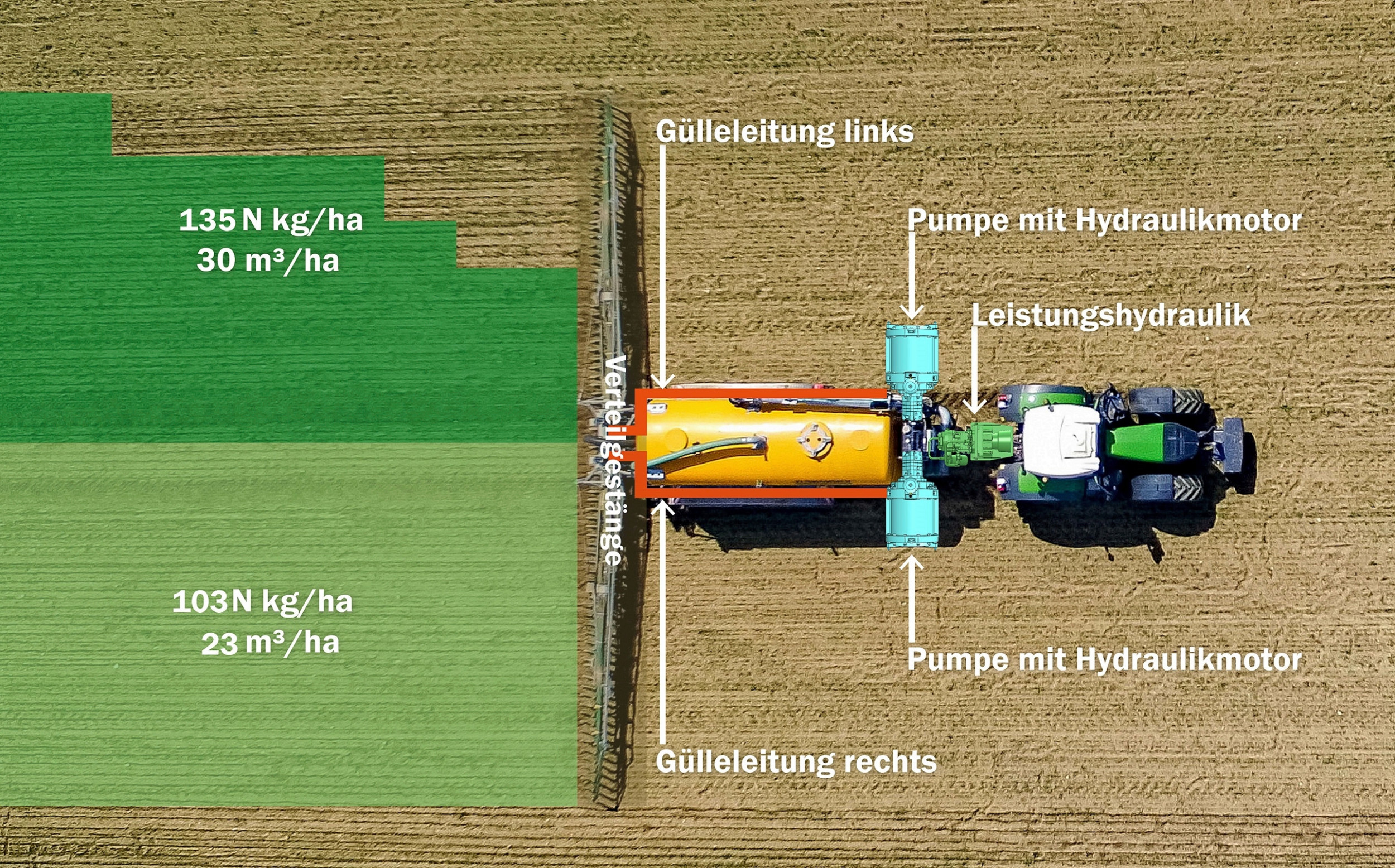 Auf der Agritechnica wird Zunhammer das neu entwickelte ECO-Duo Vario vorstellen. Das System basiert auf Isobus-Steuerung und regelt unterschiedliche Gülle- oder Nährstoffmengen getrennt und variabel je Halbseite. Zwei variable und separat voneinander laufende Pumpen versorgen je eine Gestängehalbseite. Applikationskarten können auf einem bisher nicht erreichbaren Niveau halbseitig abgearbeitet werden. Schalten Verteilausläufe einer Halbseite aufgrund von Überlappungen durch die automatische Teilbreitenschaltung ab, wird die Fördermenge der jeweiligen Güllepumpe entsprechend reguliert, um die Ausbringmenge je Hektar konstant zu halten.