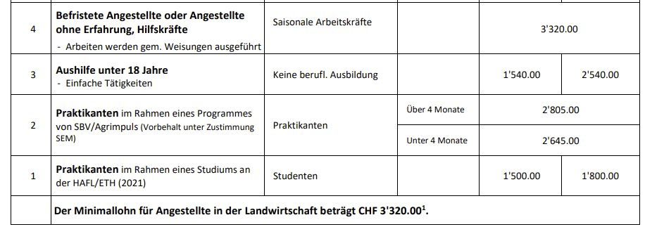 2021 verlangte die ABLA verlangt eine Lohnerhöhung von 200 Franken für sämtliche Lohnklassen. «Wollen wir die gleiche Situation wie in England, wo die Ernte auf den Feldern verrottet, weil keine Arbeitskräfte vorhanden sind? Dies wird passieren. Es sind je länger je mehr nicht genügend Arbeitskräfte vorhanden», warnte die ABLA im Oktober 2021. 20 Franken mehr ab 2020 Die Arbeitsgemeinschaft konnte ihre Forderungen nicht durchsetzen. Ganz mit leeren Händen stand sich aber nicht da.