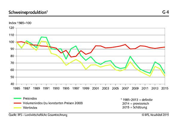 Auch bei den Schweinen wird beim Produktionswert mit einem -17,2 Prozent ein deutlicher Rückgang erwartet. Die Preise sind seit Sommer 2014 auf dem Sinkflug, haben sich nun aber auf tiefem Niveau stabilisiert. Eine höheren Produktionswert wird bei der Rindviehproduktion (+2,6%) sowie bei der Geflügel- und Eierproduktion (+1,8%) erwartet.