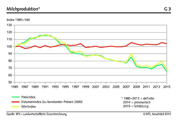 Ein dramatischer Rückgang wird bei der tierischen Produktion erwartet. Gemäss der Prognose des BFS geht diese um 8,7 Prozent (-464 Mio. Fr.) zurück. Der Wert der Milchproduktion dürfte gegenüber 2014 um 14,6 Prozent sinken und somit unter die Grenze von 2,0 Milliarden Franken fallen. Das russische Lebensmittelembargo, die Aufhebung der EU-Milchkontingente und die Aufhebung des Mindestkurses Mitte Januar 2015 haben die Schweizer Milchexporte deutlich beeinträchtigt. Der Milchpreis brach Anfangs 2015 drastisch ein. „Die Kombination aus tiefem Preisniveau und begrenzten Futtermitteln aufgrund der Trockenheit bewirkt, dass auch die Milchlieferungen zurückgehen“, so das BFS.