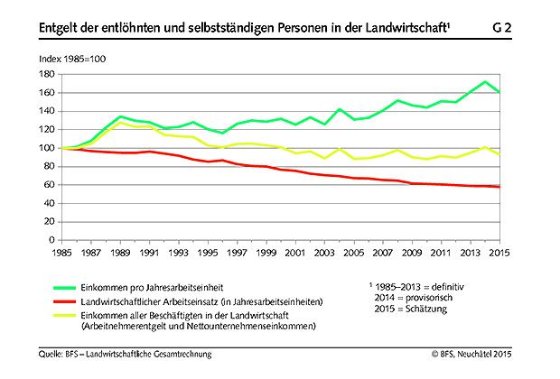 Das Einkommen des Landwirtschaftssektors (Nettounternehmenseinkommen), das die Arbeit und das eingesetzte Kapital entschädigt, wird auf 2,9 Mrd. Fr. geschätzt. Das sind 10,9 Prozent oder 350 Mio. Fr. weniger als 2014. Gemäss dem Bundesamt für Statistik wird das gesamte Entgelt des Sektors für Arbeitnehmende (1,3 Mrd. Fr.) und Selbstständigerwerbende (Nettounternehmenseinkommen 2,9 Mrd. Fr.) rund 4,2 Mrd. Fr. betragen.