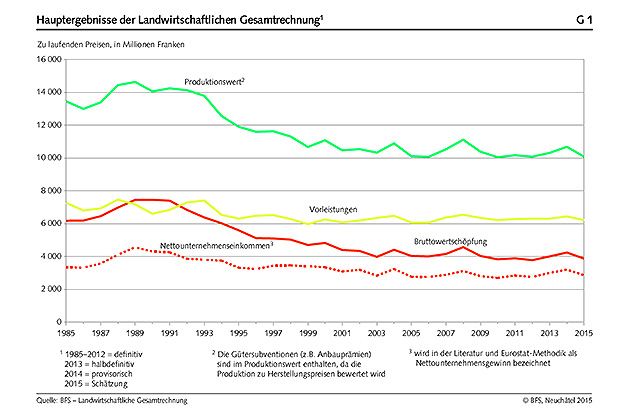 Nach den Anstiegen in den Jahren 2013 und 2014 ist das Einkommen der Schweizer Landwirtschaft wieder rückläufig. Ertragsseitig wird ein Gesamtproduktionswert von 10,1 Milliarden Franken erwartet. Das entspricht einen Rückgang von 5,5 Prozent (-592 Millionen Franken) gegenüber 2014.