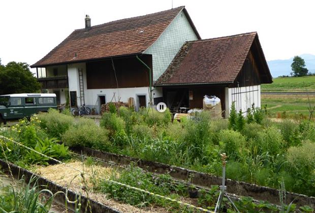 Brennnesselstauden, Johannisbeeren und Wilde Möhren wiegen sich sanft im Sommerwind. Neugierig herunterblickende Geissen roden ein mit Brombeeren zugewachsenes Stück Land. Maisstauden und Sonnenblumen scheinen miteinander zu tanzen. Schon die Zufahrt zum Auenhof nahe Feldbach ist ein Erlebnis. Hier wachsen wortwörtlich "Chrut und Rüebe" durcheinander. Doch was wie ein wunderschönes Chaos aussieht, ist ganz bewusst so gestaltet. Die unglaubliche Fülle und Vielfalt an Pflanzen, Farben und Düften ist das Ergebnis des ersten halben Jahres Permakultur auf dem Lern- und Demonstrationshof der Akademie für Permakultur-Gestaltung über dem Zürichsee.